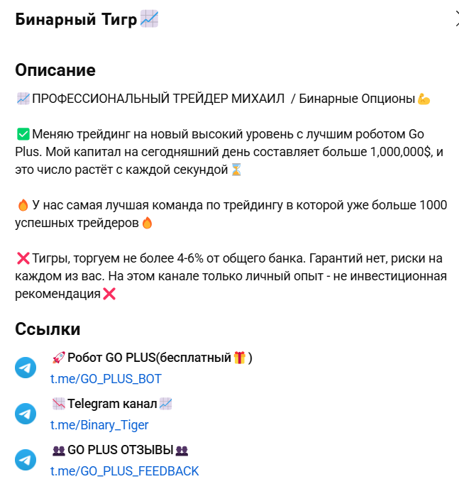 Оценка проекта «Бинарный Тигр»: реальные отзывы об инвесторе MixaTrader и телеграмм-боте Go Plus Bot, условия заработка на Binary Tiger Bot