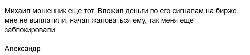 - Жалобы людей на мошенничество со стороны Михаила, пользователи вкладывают деньги по системе трейдера и теряют их, автор проекта блокирует их профили.