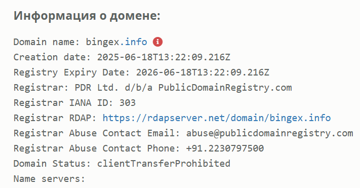 Скорее всего, у компании не было никаких аккаунтов в социальных сетях, потому что поиск по имени «Бингех» результатов не дал, причем даже контакты поддержки неизвестны, а все, что можно хоть как-то проанализировать, это сайт. С помощью сервиса Web Names мы выяснили, что домен проекта был зарегистрирован 18.06.2025, а так как в августе 2025 года ресурс уже недоступен, это вызывает сомнения в добросовестности владельцев.