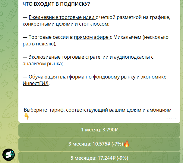- подписка на закрытый клуб Биржевик канал о рынке акций на сегодня — в месяц 3800 рублей, 17250 рублей за 5 месяцев;