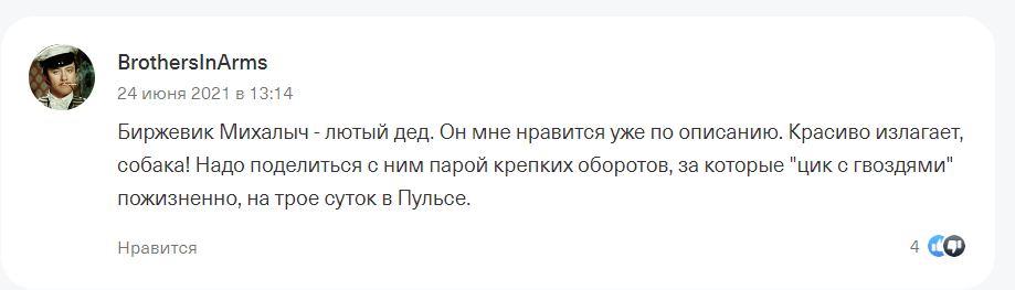 Вроде говорит чётко и по делу, слежу за биржевиком уже достаточно продолжительное время. Советы дельные даёт, только вот оценить в реальные портфель трейдера нет возможности — почему-то свою ссылку на него не даёт.