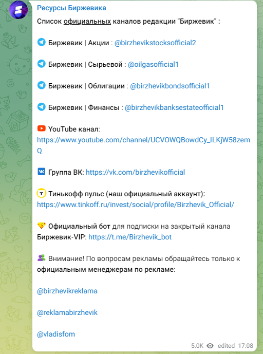 - Паблик ВК Биржевик Инвестиции Акции Облигации — birzhevikofficial, аудитория 38 000 человек, собраны посты из всех ТГ каналов.