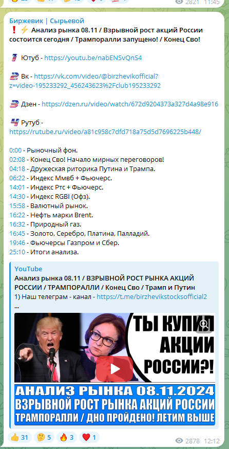 Активность на канале Биржевик Сырьевой в Тг нельзя назвать слишком высокой. На трейдера подписано 28+ тысяч человек. При этом публикации смотрят 2-4 тысячи пользователей. Большинство реакций закрыто. Можно оставлять только «положительные». Их набирается не более 100 в среднем. Говорит ли это о накрутке пользователей? – Возможно. А еще возможно, что канал перестал отвечать интересам аудитории, так как даже на ранних этапах работы публикации с него просматривались активнее.В описании канала есть 3 ссылки: