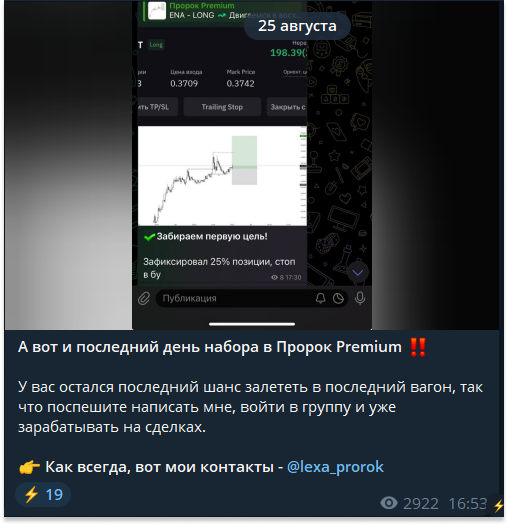Помимо бесплатных сигналов, трейдер платно работает с подписчиками в закрытом телеграмм-канале. Правда, набор завершился 25 августа и подробных условий не узнать. По заявлениям Алексея, приватка создана для заработка, а значит вход осуществляется за определенную сумму. Как правило, подобные сообщества стоят от 100 до 1000+ долларов.