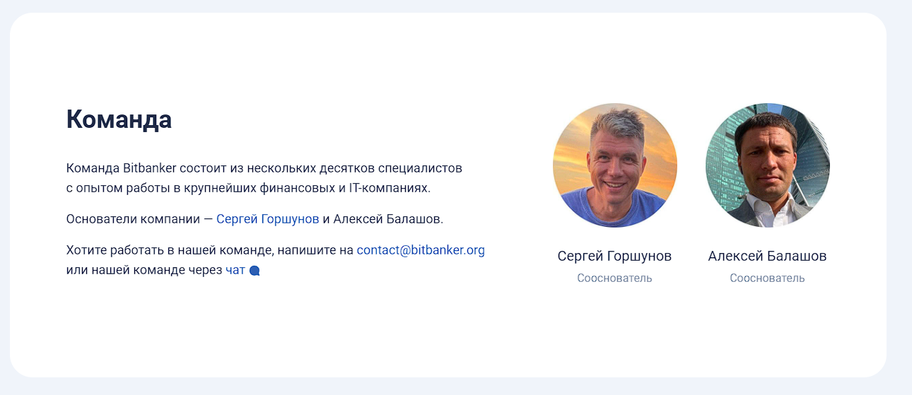 Криптоплатформа Bitbanker ru была запущена в 2021 году Сергеем Горшуновым и Алексеем Балашовым. Представительства компании есть в Москве, Санкт-Петербурге и Екатеринбурге. В 2023 году были открыты офисы «БитБанкер» и за рубежом – в Бишкеке и Дубае.