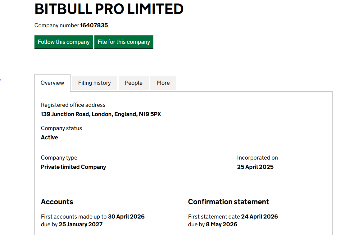 Bitbullpro заявляет о регистрации в Великобритании. Компания BITBULL PRO LIMITED, номер 16407835. Мы нашли эту фирму в британском реестре. Да, она существует. Зарегистрирована 25 апреля 2025 года в Лондоне.