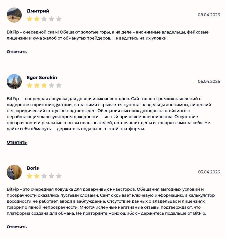 Все отзывы о платформе BitFip в интернете датированы весной 2026-го года. Это с высокой вероятностью говорит о том, что площадка работает не полгода, как мы отмечали выше, а всего несколько недель.