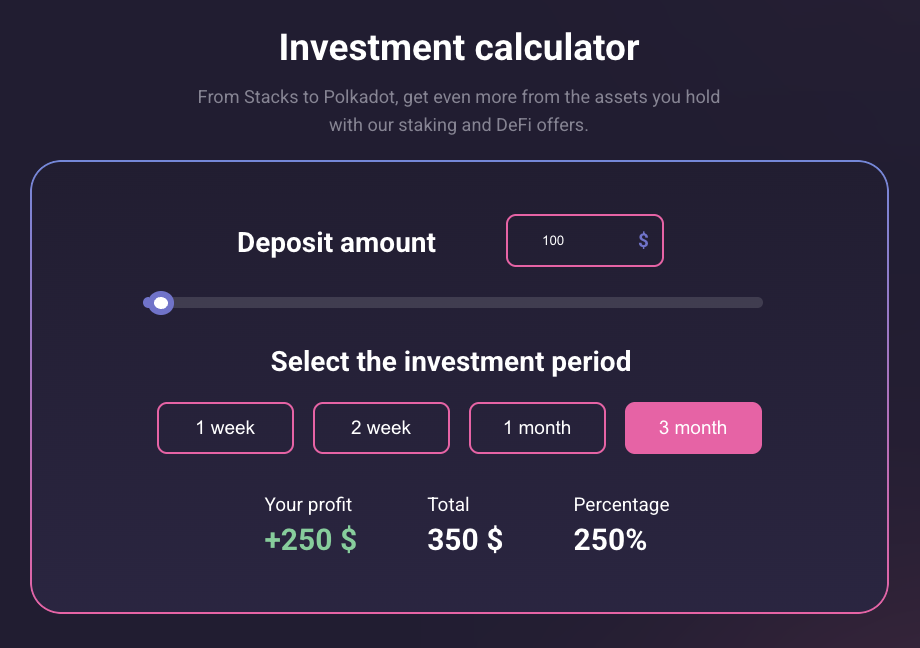 Также скамеры могут заводить на такие сайты новичков в крипто-инвестировании, обещая им огромную прибыль за стейкинг цифровых активов. В пользу того, что владельцы данной биржи используют именно эту схему лохотрона, говорит наличие на сайте калькулятора стейкинга.