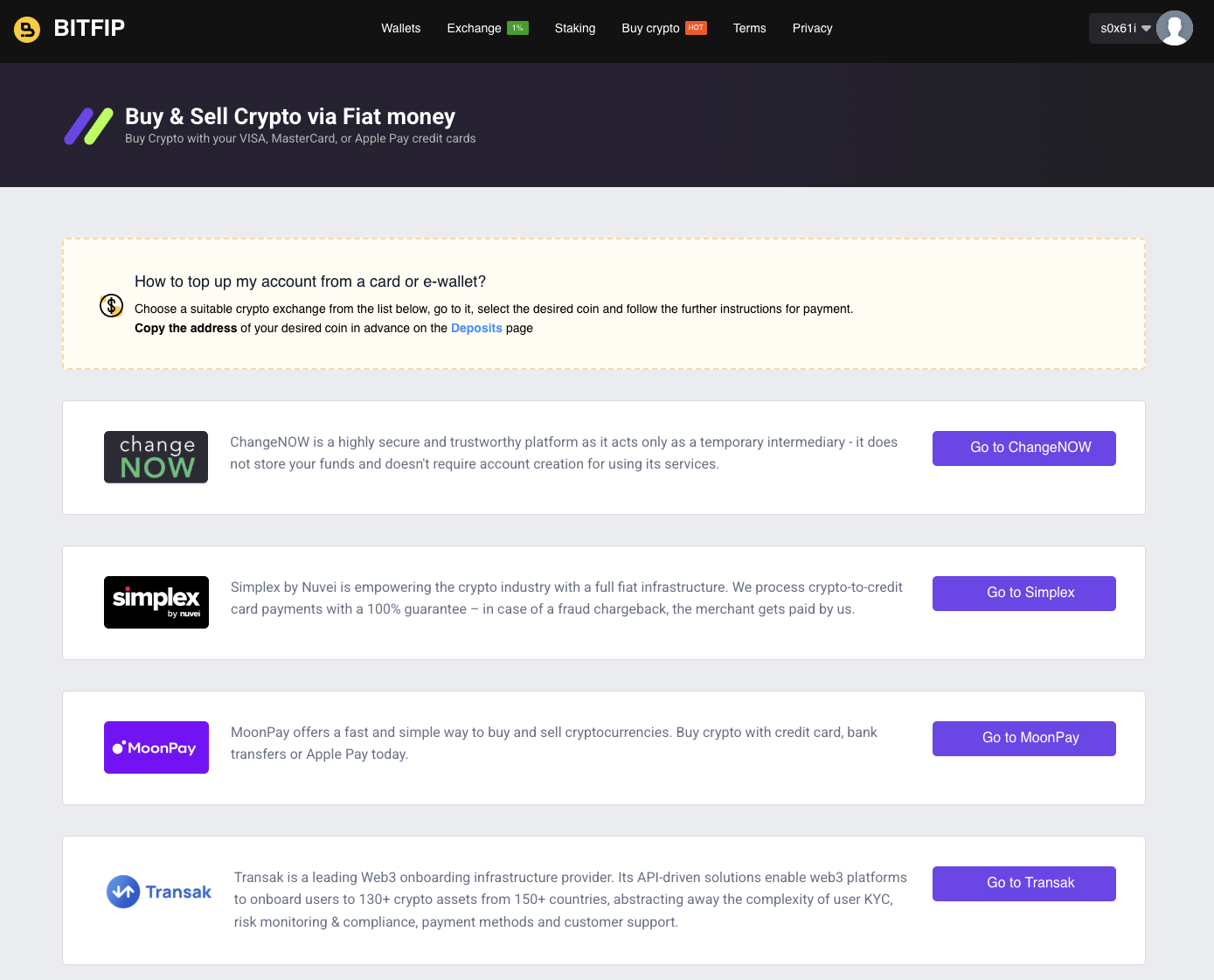 Пополнить баланс криптобиржи «Бит Фип» напрямую нельзя. Клиенты, которые хотят внести средства с банковской карты, должны воспользоваться одним из предложенных платежных сервисов, например, MoonPay.