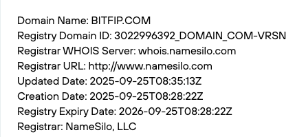С целью определить, сколько времени работает площадка, мы запросили данные домена ее сайта из WHOIS. Выполнив это, мы выяснили, что регистратор доменных имен выдал адрес bitfip com в конце сентября 2025-го года.