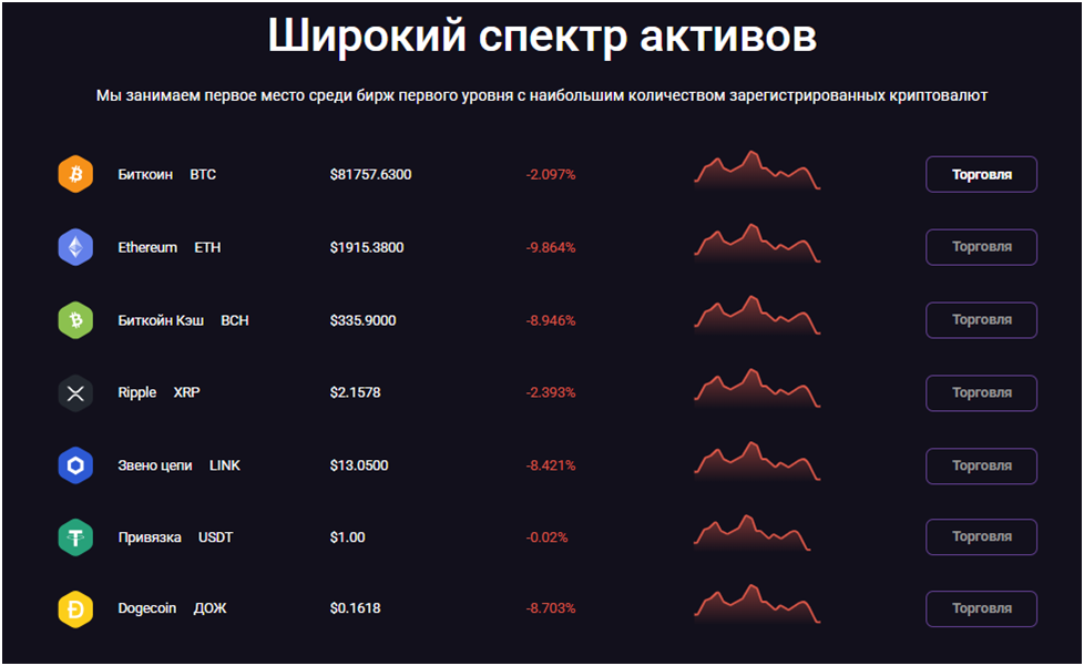 На главной странице можно найти список активов, которые доступны для проведения торговых операций. В перечне есть популярные токены и монеты, что указывает косвенно на то, что площадка подойдет разным трейдерам.