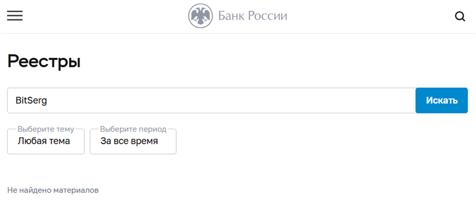 О BitSerg com нет достаточного количества отзывов и сведений, чтобы однозначно говорить о том, что услуги обменника предоставляют законно. К тому же, сервис доступен для клиентов из России, но лицензию от официального регулятора не получил, на что указывает отсутствие упоминаний о нем в реестрах Центробанка.