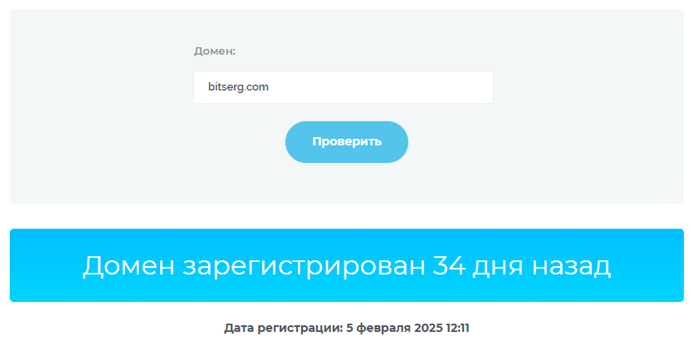 Платформа «БитСерг» запущена через сайт, который появился в феврале 2025 года. На март того же года проект считается довольно молодым, поэтому к нему стоит проявлять особое внимание.