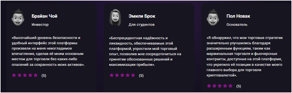 На сайте есть раздел с отзывами о бирже BitSerg, где люди оставляют исключительно позитивное мнение и ставят оценку в пять звезд.