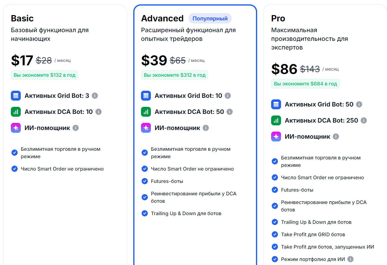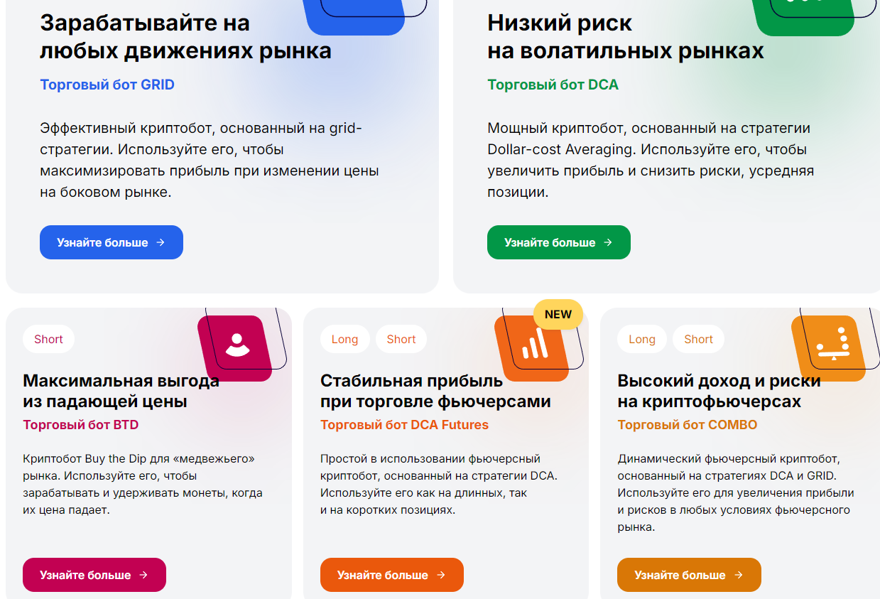- Бот DCA: для усреднения позиций и уменьшения рисков.
