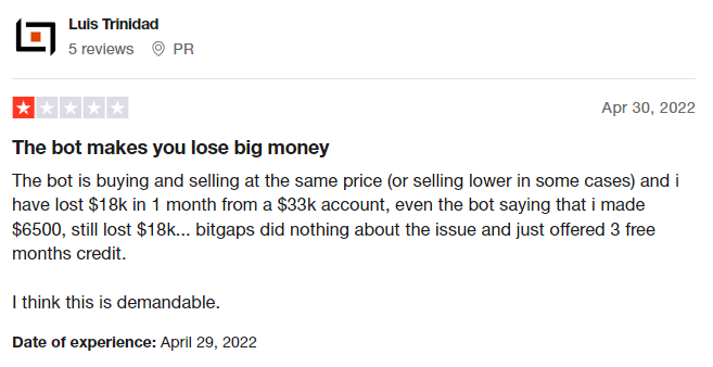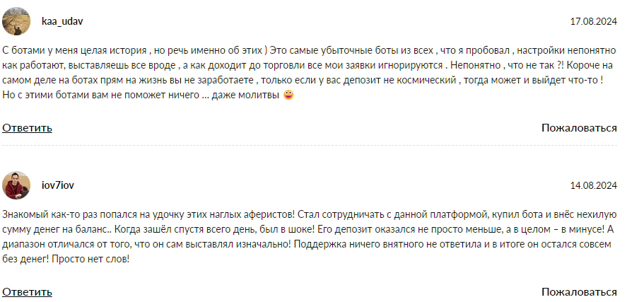 Пользователи рассказывают о плохой работе сервиса, утверждают, что бот продает дешевле чем покупает. Один из клиентов заявляет, что потерял уже 18 тыс. долларов. Также говорят о плохой работе тех. поддержки helpdesk bitsgap com support home, жалуются на отказ в возврате средств.