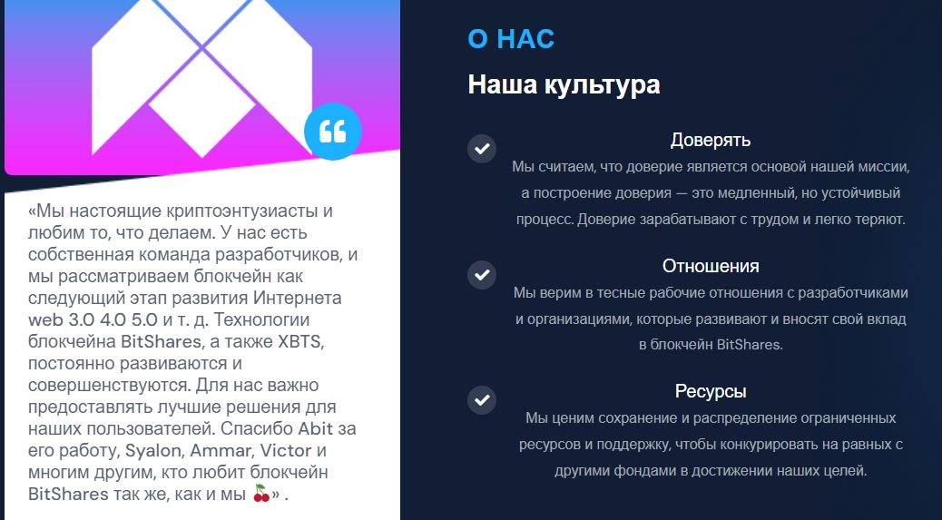 Основной сайт bitshares international появился в марте 2021 года. На нем представлены все особенности деятельности блокчейн-платформы для запуска децентрализованных финтехов. Созданы комьюнити BitShares Group в телеграмме (1572 фолловера), BitSharesGroup в сети X (2764 подписчика), на сайте BitSharesGroup com (1200 членов). Имена разработчиков и руководителей блокчейна известны, установлены ценности корпоративной культуры.
