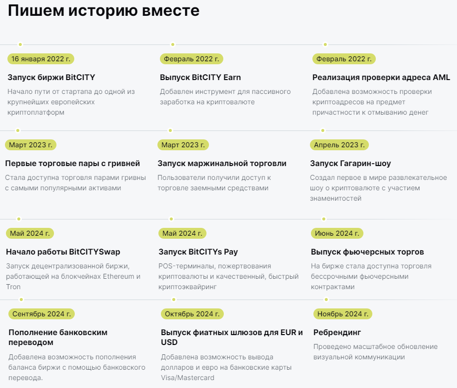 В 2024 году на площадке Bittcity Com были запущены: развлекательная программа, децентрализованная биржа, возможность пополнение счета через банковский перевод и отправка фиатных активов на банковские карты.