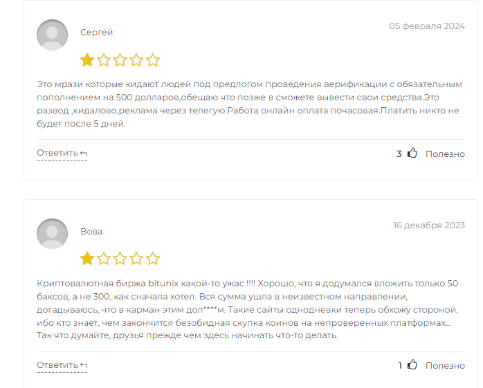 О торговой площадке Bitunix отзывы в сети найти трудно, зато полно негативных отзывов о Bitunix us. Мошенники создали одностраничный сайт с названием реальной биржи и разводят пользователей на деньги. Вклады принимают, даже создают какую-то видимость торговли, но вывести средства с платформы нельзя. Этот ресурс не имеет отношения к оригинальной бирже. Актуальные ссылки на социальные сети и сайт можно найти в официальном канале Bitunix ТГ.