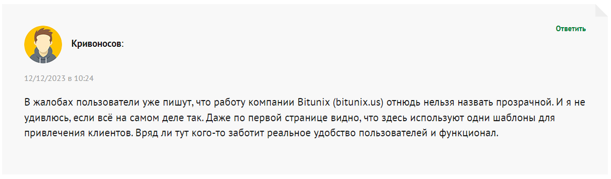 Сайт Битуникса выглядит шаблонно и сразу заметно, что что-то здесь не так. Мало информативности, многие кнопки не активны, отзывы все однообразные и не раскрытые. Лично у меня биржа доверия не вызывает, скорее косят под оригинал.
