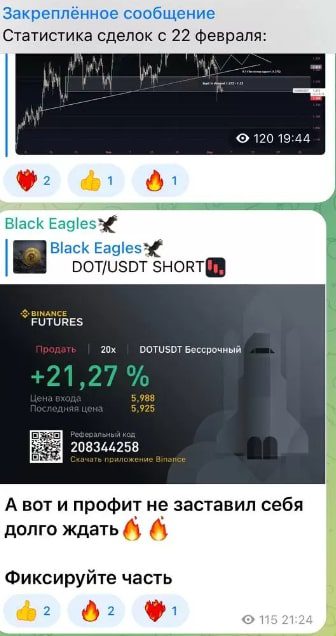 Black Eagles — Телеграмм ресурс, в котором пользователям дают бесплатные сигналы на криптовалюты. Трейдер проводит марафон, где разгоняет сотню долларов до тысячи. А также продает свои услуги — приватный клуб и обучение. На момент написания статьи автор удалил все публикации и закрыл доступ в канал.