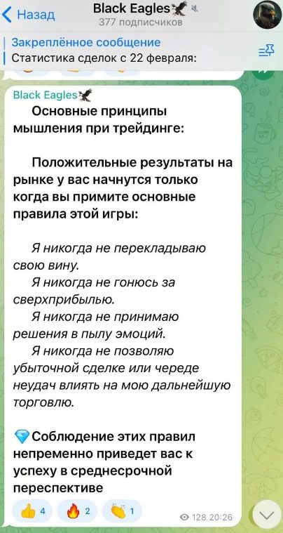 Сложно сказать, были ли полезны бесплатные сигналы автора, но точно настораживают цены. Обычно низкую стоимость выставляют мошенники, чтобы просто пополнить свой кошелек без оказания каких-либо услуг. Есть и другой вариант, при котором автор канала просто копирует сделки из разных сообществ и зарабатывает небольшую прибыль с платного клуба. В любом случае сейчас канал обнулен и готовится к новому формату, а что это будет — покажет время. Если у вас есть дополнительная информация о канале Black Eagles, расскажите об этом в комментариях.