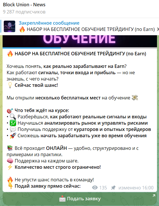 Block Union — канал в Телеграмме, ориентированный на новичков в сфере трейдинга. Создатели сообщества предлагают регулярное добавление новостей и возможность обучения базовым навыкам торговли на финансовых рынках. В обзоре ниже поговорим об особенностях платформы. Выделим слабые и сильные стороны Блок Юнион.