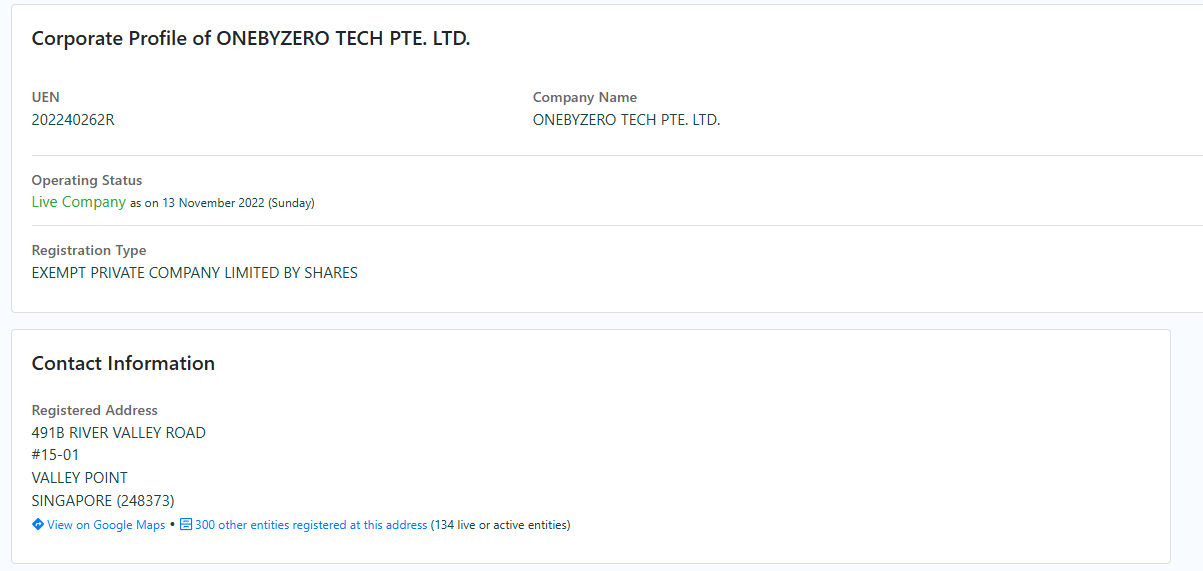 В одном из разделов сайта Blockonomics мы нашли информацию об организации – указано, что она зарегистрирована в Сингапуре. Юридическое лицо называется OneByZero Tech Pte Ltd, это частная акционерная компания, сведения подтвердились при проверке через публичные реестры.