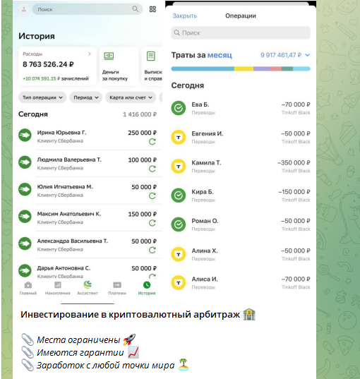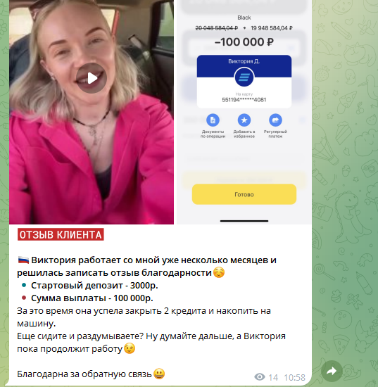 Еще один аргумент в пользу сотрудничества с командой Анастасии — большое количество скринов якобы выплат клиентам, закрытия их долгов по кредитам, а также переводов крупных сумм на благодетельность.