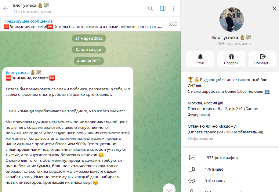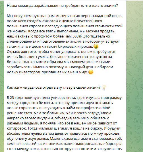 Администратор и владелец канала представилась как Анастасия, работает под ником ETH Nasyta. О себе девушка выдала минимум информации — только сообщила, что в 23 года окончила университет международного бизнеса, без уточнения — где и когда. Дальше она рассказывает, что создала команду трейдеров, которая занимается арбитражем и пампом криптовалют. Этот бизнес якобы приносит им баснословные доходы. Они арендуют офис в самом дорогом бизнес-центре Москвы — Башне Федерация и предлагают зарабатывать вместе с ними всем желающим.