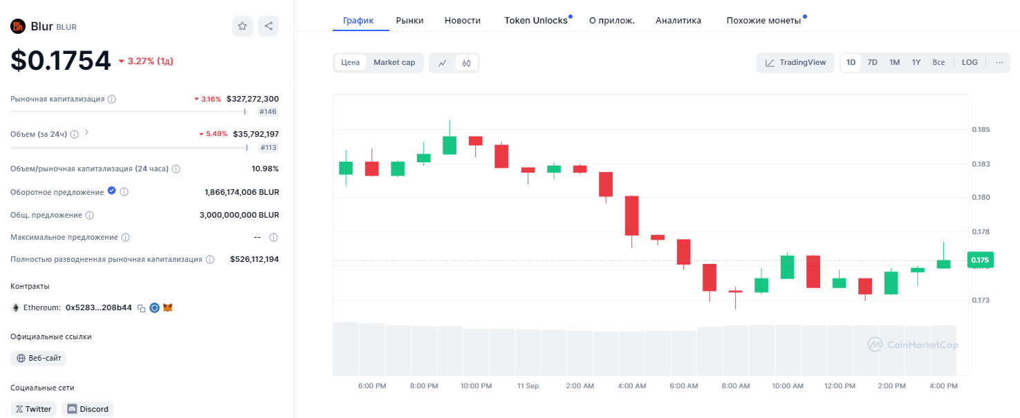 Токен Blur был выпущен в 2023 году. Он отчеканен на блокчейне эфира и имеет следующие показатели: