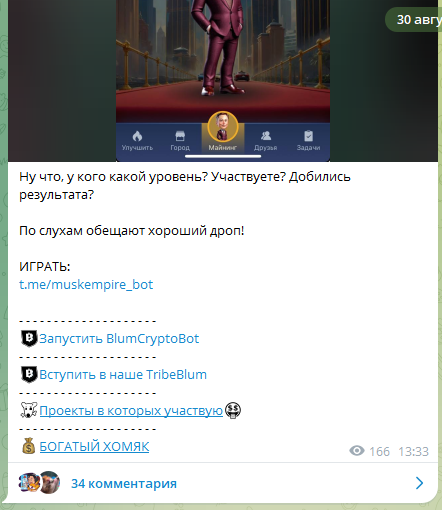 Трейдер освещает события из мира криптовалют, финансовых рынков и популярных токенов. Он активно предлагает участие в различных проектах и ботах, таких как BlumCryptoBot и Musk Empire. Основной акцент делается на получение дропов, листинги токенов и новости, влияющие на крипторынок.