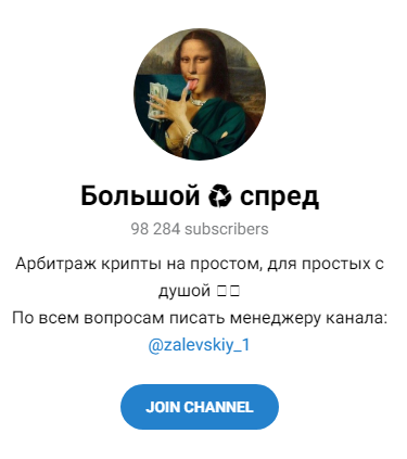 Мы не советуем заработок с «Большой спред». Не факт, что этот канал принадлежит опытному арбитражнику. Учитывая его анонимность, риск потерять здесь деньги велик.