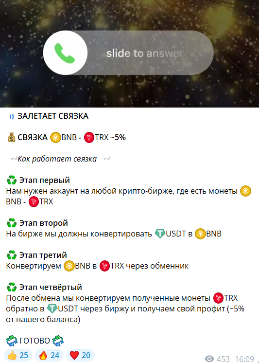 Канал «Большой спред» ведет арбитражник Жена Залевский. Он якобы опытный трейдер, эксперт в торговле криптой. Он делится р2р связками и рассказывает, как зарабатывать на арбитраже криптовалют. Мы изучили ленту этого канала, отзывы о ней реальных людей и пришли к выводам: