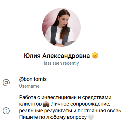 Юлия Александровна заявляет, что работает с инвестициями и средствами клиентов. “Пишите по любому вопросу” – указывает менторша, ведь ее главная цель – завязать диалог.