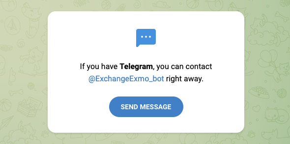 На 27 августа 2024-го года телеграмм-бот Exmo недоступен. При этом, не удается найти информации о том, что проект прекращает или приостанавливает работу. Следовательно, очень вероятно, аккаунт был удален модерацией мессенджера.