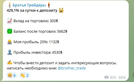 Братья Трейдеры — канал в Телеграме, на котором два брата-трейдера предлагали раскрутку депозитов. Они обещают огромную прибыль без усилий и при небольших вложениях. Рассмотрим, что собой представляет этот канал и насколько безопасно доверять ему деньги.