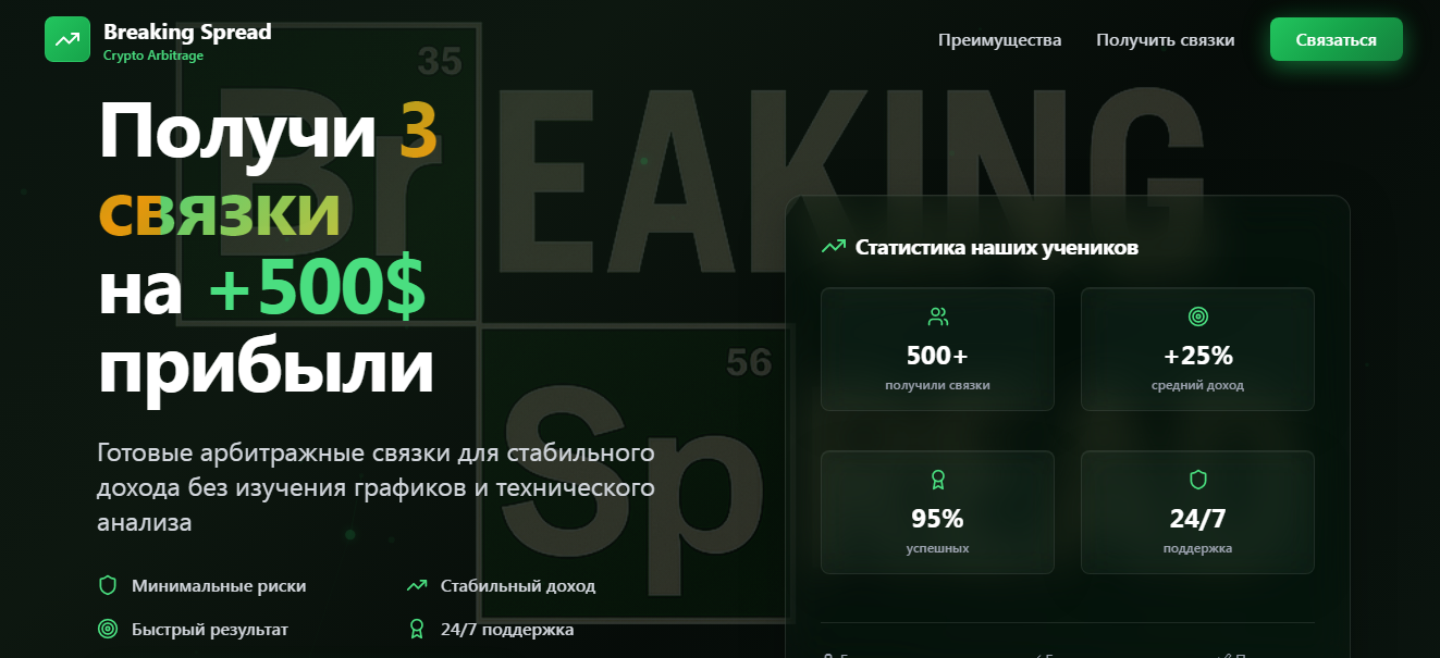 Breaking Spread – это платформа, которая предлагает каждому желающему зарабатывать на арбитраже криптовалют. Проект был запущен в 2025 году. Автор проекта обещает научить зарабатывать даже новичков и делиться рабочими Р2Р связками.