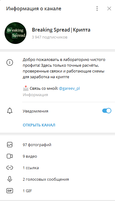 Проект продвигается также через телеграмм-канал «Breaking Spread Крипта». Он был создан 20 декабря 2023 года, но первый контент опубликован только 2 апреля 2025 года. С июля он активно начал публиковать посты о крипто арбитраже и призывы начинать зарабатывать вместе с Breaking Spread. Он собрал аудиторию 3,9 тысяч человек, но читает канал gareev pl меньше 10%, что может указывать на накрутку. Комментарии в ленте отключены.