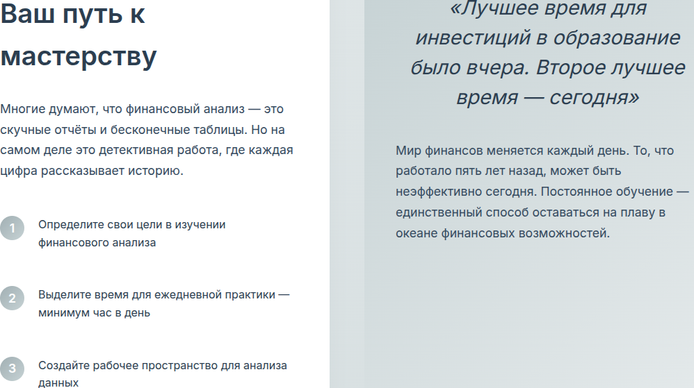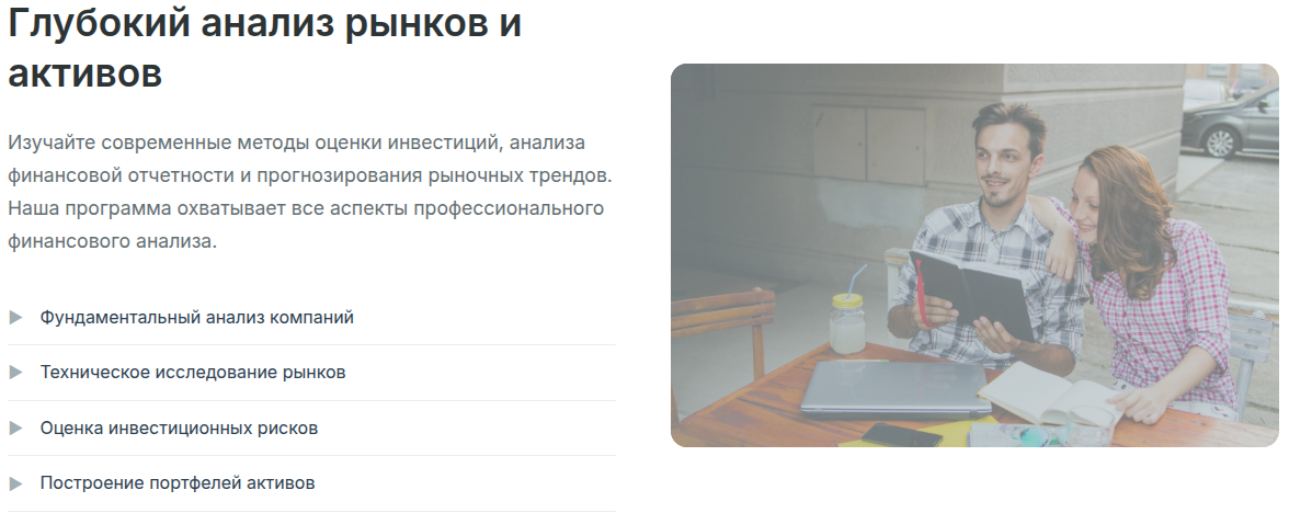 В блоке с преимуществами для лучшей убедительности разработчики школы Bright Ledger утверждают про максимальную академическую строгость. Каждый курс построен на базе финансовой теории с практическими кейсами. Под каждого клиента действует индивидуальный подход, в рамках которого лекторы подбирают специфику работы и задания.