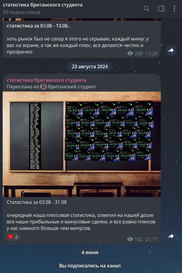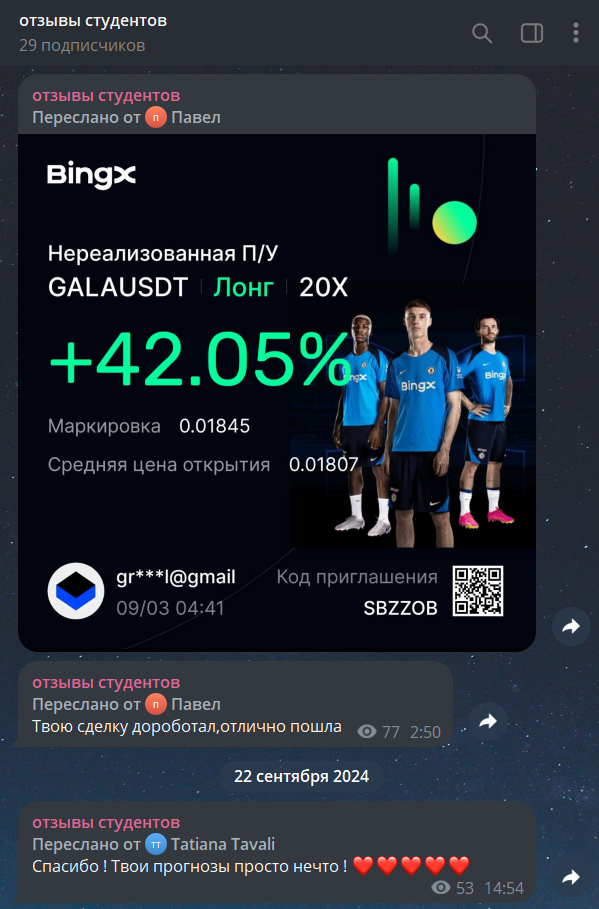 Существует отдельный канал с результатами торговли, где ученики делятся успехами в виде скриншотов. Сделки выходят исключительно в плюс, но не на очень большие суммы: от 5$ до 35$. Но с 22 сентября 2024 года группу забросили.