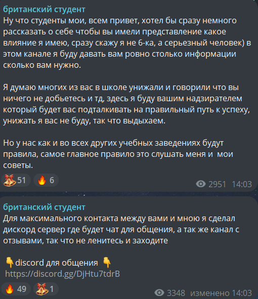 Создателя канала зовут Виталий. Личных сведений о нём нет, кроме закреплённого сообщения. В нём он заявляет, что не является “шестёркой”, имеет влияние и выступает в качестве серьёзного человека – надзирателя для своих студентов. Главные правила: слушать админа и его советы.