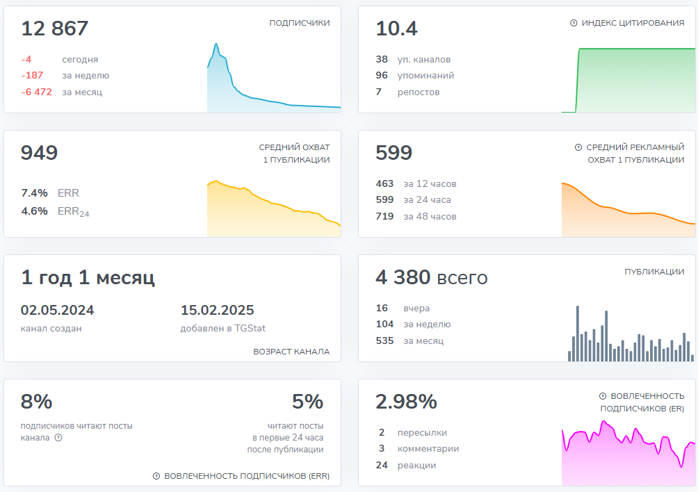 Момент создания датируется – 2 мая 2024 года. Количество всей аудитории: 13.170 подписчиков, хотя по факту действующих всего – 949, в среднем. В день успевает выходить около 20 новых постов. Комментарии включены почти везде, лишь на некоторых постах они отключены, а реакции ограничены 5 положительными эмодзи – огонь, палец вверх, сердечко, голубь с веткой и тг-звезда.