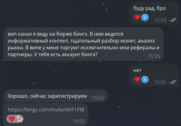 Связавшись с автором, тот спрашивает имя, опыт торговли и уделяемое ей время, после чего вводит в курс дела. Випка содержит информативный контент, анализ рынка и подробные разборы монет. Торгует автор на бирже BingX, как и участники группы, являющиеся рефералами и партнёрами, поэтому требует зарегистрировать аккаунт и скинуть ID. Далее нужно пройти расширенную верификацию, предоставив документ удостоверяющий личность и биометрию.