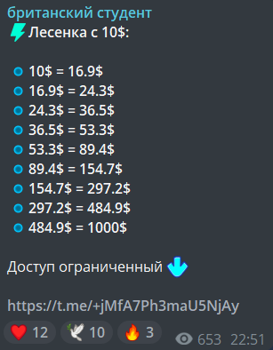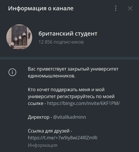 Британский студент – телеграмм канал анонимного трейдера, который обучает торговле на биржах. Использует реферальную систему для привлечения людей на платформу BingX. Продвигает вип канал с аналитическими, учебными и информационными материалами, пока что за бесплатно.