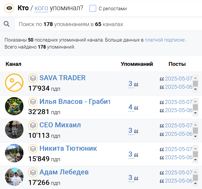 Имеется специальный канал со статистикой, где публикуются результаты за месяц или неделю, но она заброшена с 23 августа 2024 года и вышло только три поста.