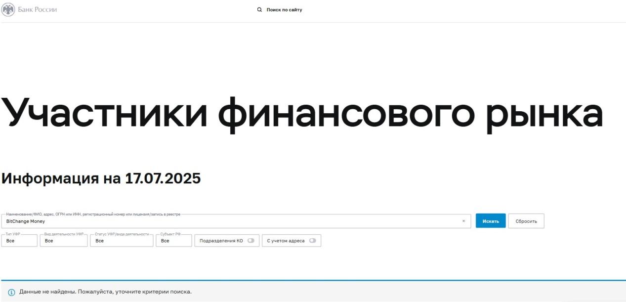 Юридические документы на сайте не представлены. Нет информации о владельцах компании. Мы проверили биржу через реестр ЦБ РФ. Там фирма не числится ни как BitChange Money, ни как Btfinex. Торговая платформа ведет свою деятельность незаконно.