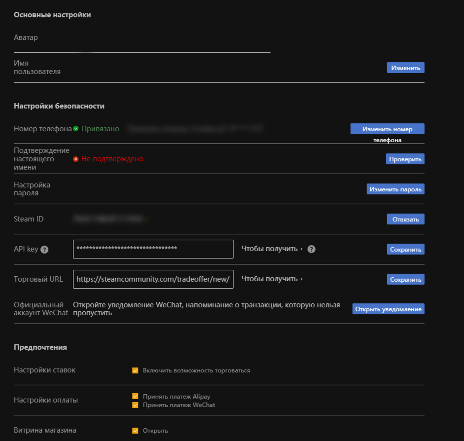 Для начала надо пройти стандартную процедуру регистрации. Надо указать имя пользователя, номер телефона, Steam API и ссылку на API ключ для торговали. Важно понимать, что российские номера не проходят, но можно указать казахстанский.