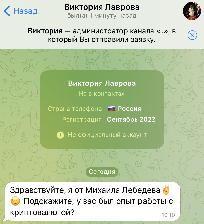 Дело в том, что сразу после подачи заявки на вступление вам придет сообщение от администратора сообщества Виктории Лавровой, эксперта FORMULA BYBIT official channel. Имейте ввиду, что беседа будет долгой.