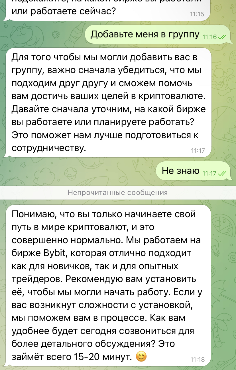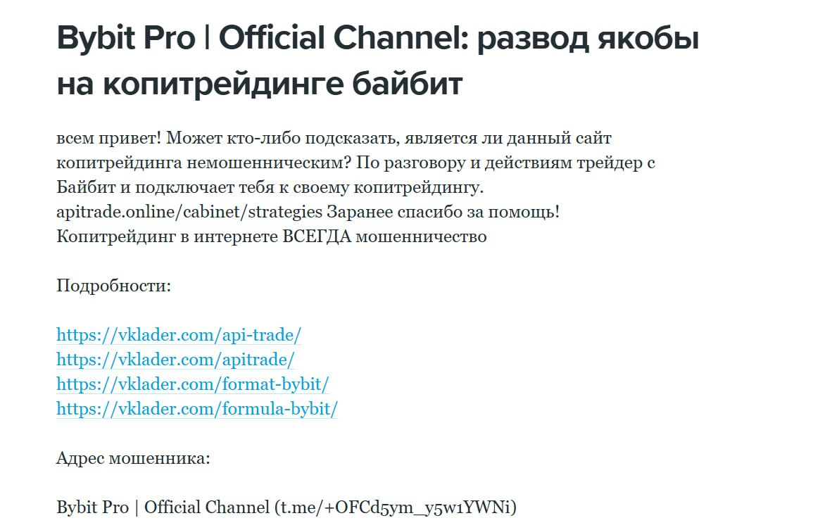 - мнение самой администрации мессенджера о том, что Bybit Pro Official Channel — развод;